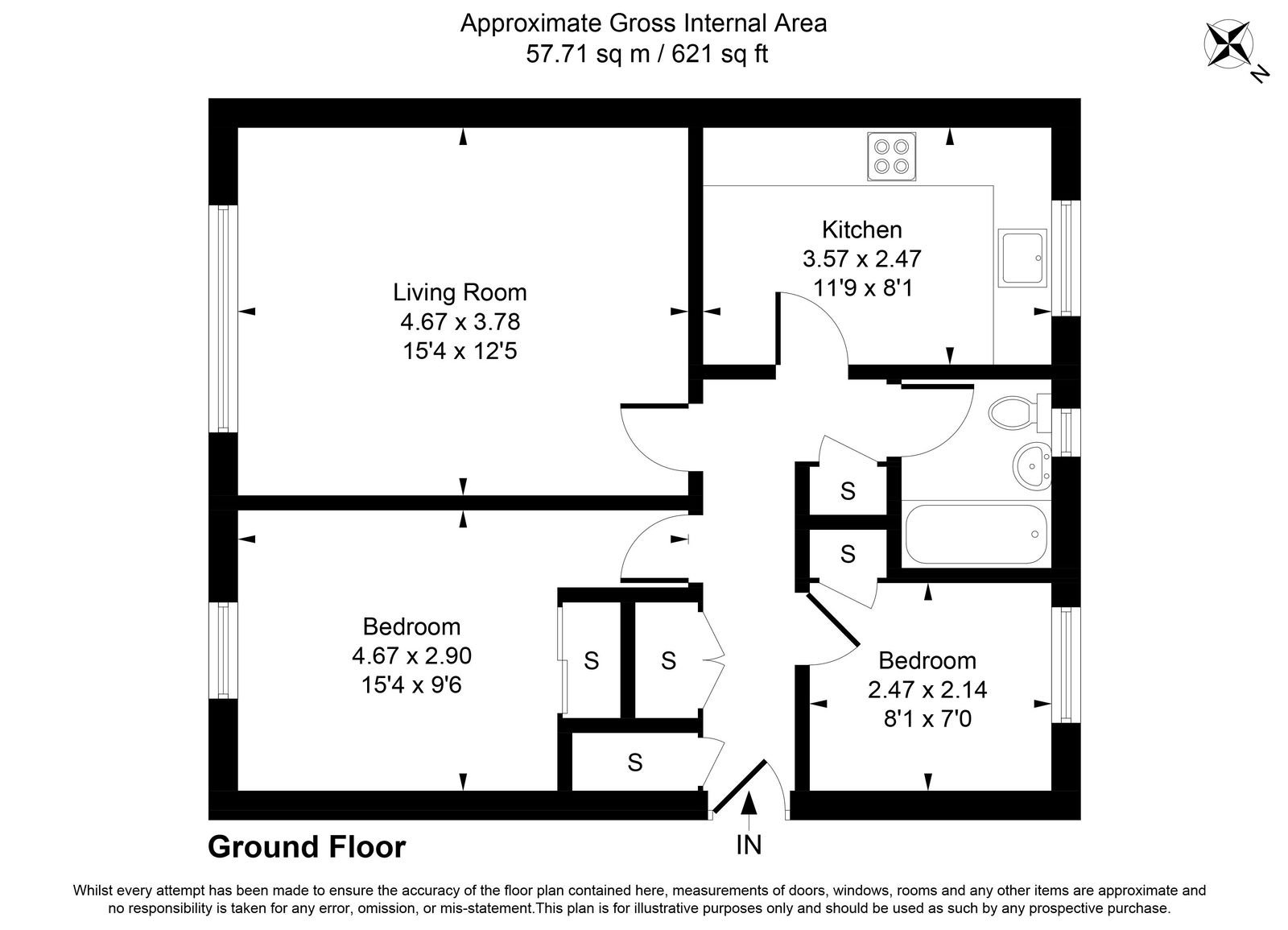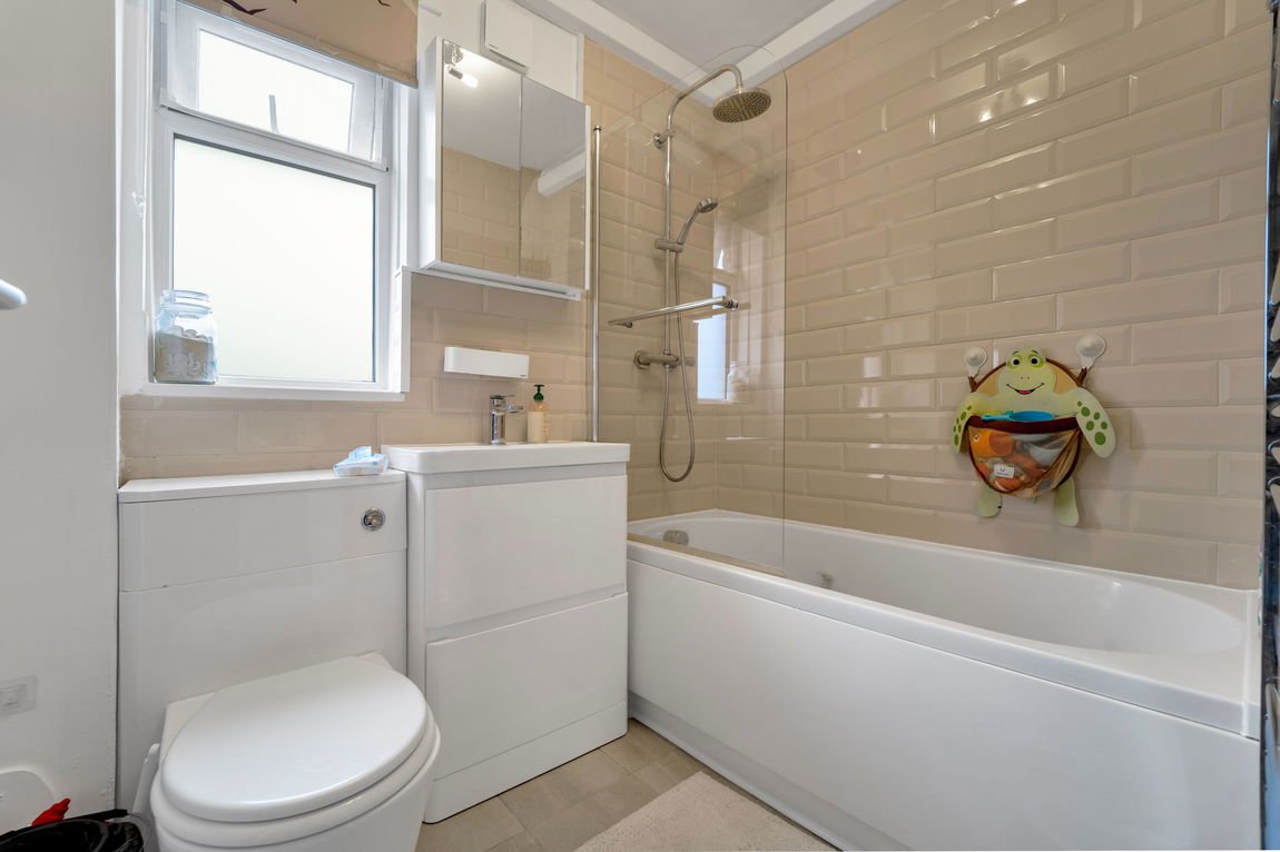 The property is accessed via its own private entrance leading into a central hallway with useful built-in storage cupboards. To the front, the spacious living room (15’4 x 12’5) enjoys a pleasant outlook and provides ample space for both seating and dining, making it a comfortable and versatile main reception area.