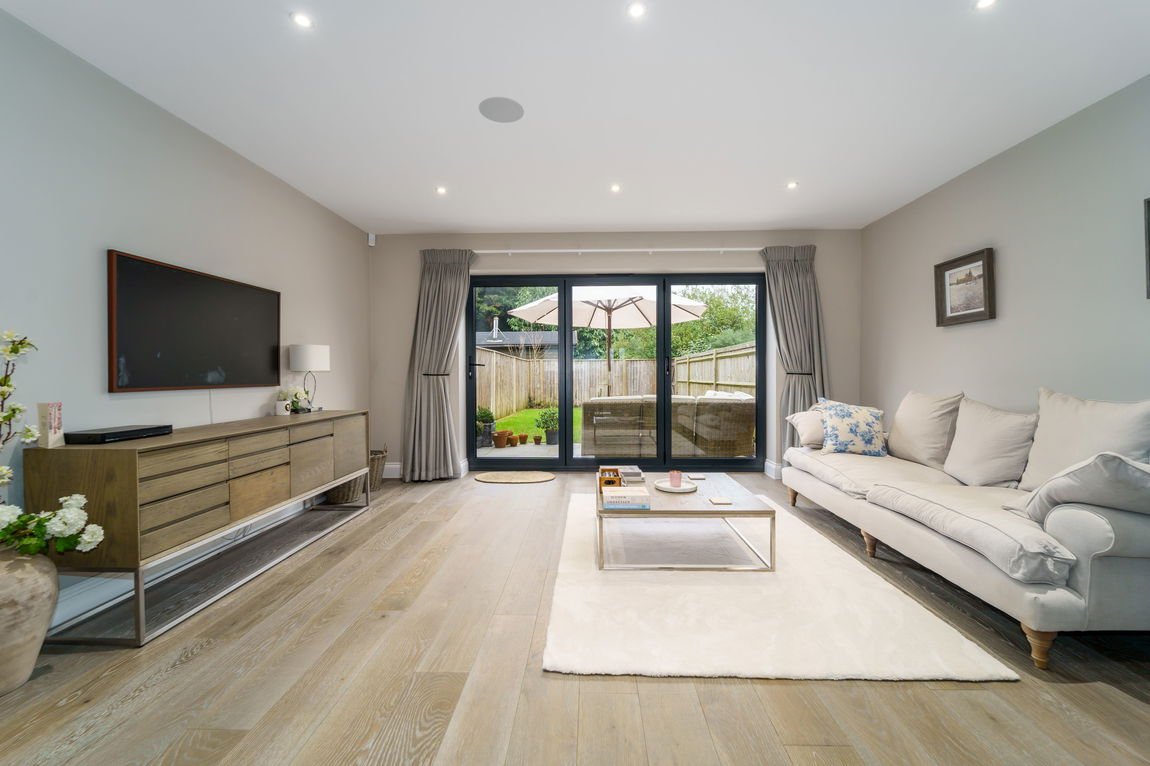 The home features a stunning open-plan kitchen/family room fitted with high-gloss units, Silestone worktops, and premium integrated appliances. This versatile space is perfect for entertaining or relaxed family living, with bi-fold doors that open out onto the garden, seamlessly connecting indoor and outdoor spaces.